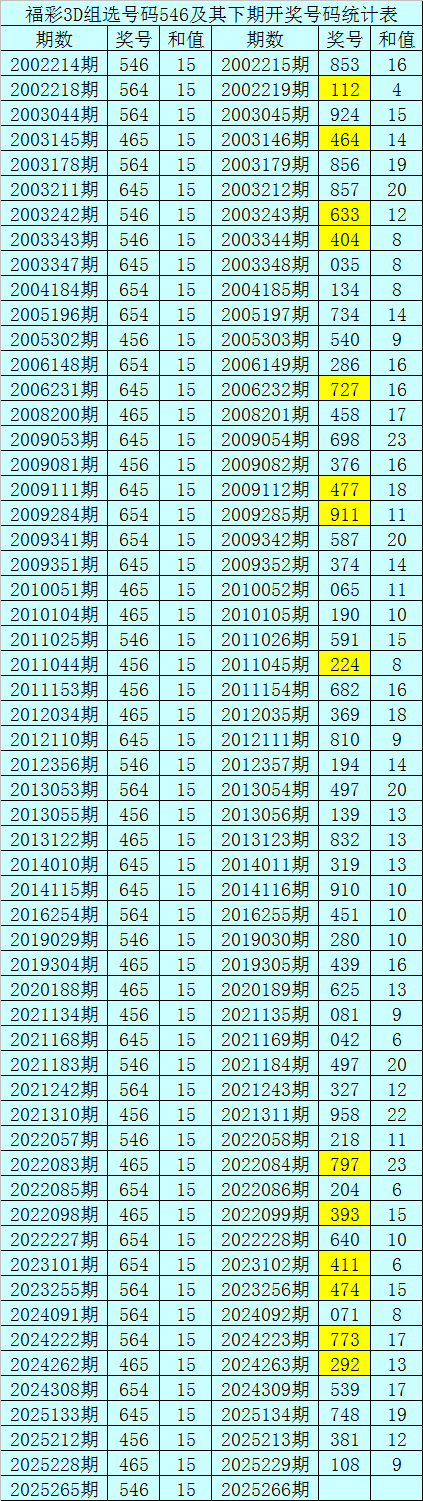 二、组选分析:历史上组选号码546开出了58次,其下期奖号分别为:853-112-924-464-856-857-633-404-035-134-734-540-286-727-458-698-376-477-911-587-374-065-190-591-224-682-369-810-194-497-139-832-319-910-451-280-439-625-081-042-497-327-958-218-797-204-393-640-411-474-071-773-292-539-748-381-108,其开出期数和下期奖号统计为: